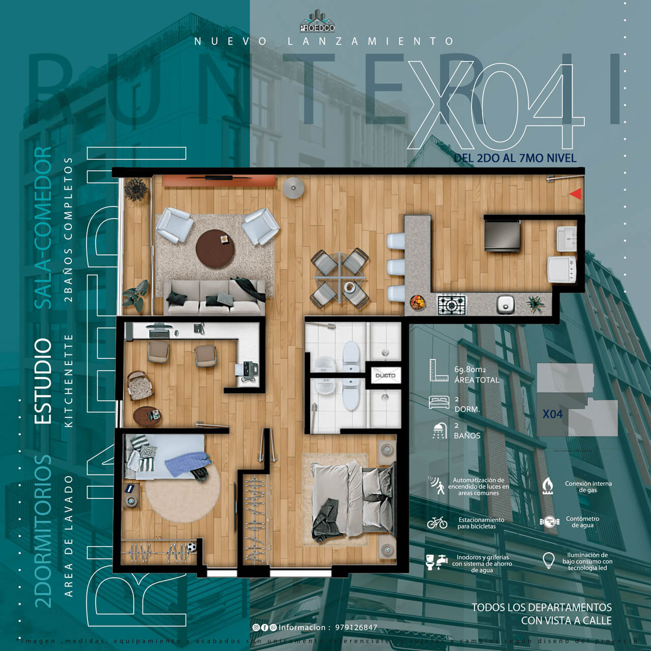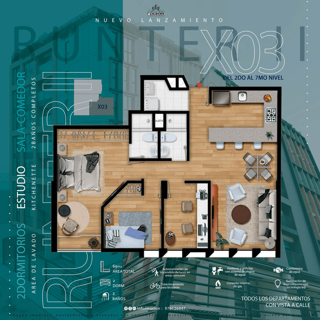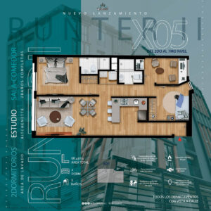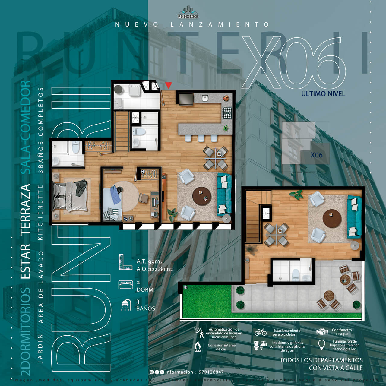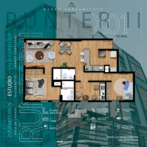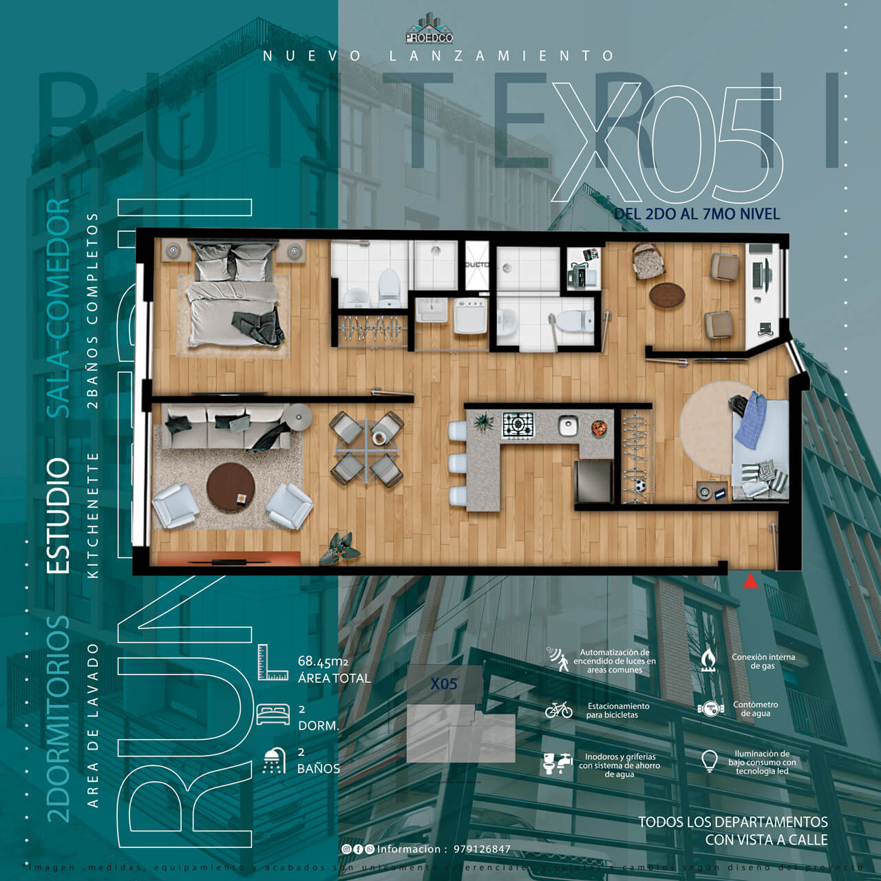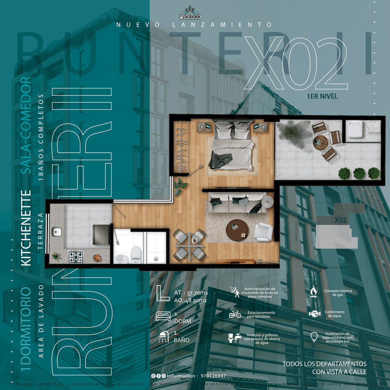 Tipos de departamentos entre FLAT y DUPLEX con acabados de primera y la distribución diseñada a tu necesidad. Edificio Runter nos brinda un diseño de fachada CARAVISTA con balcón y mamparas que le da la elegancia y la luz a cada espacio de tu vivienda: 8 pisos, 23 departamentos, 16 unidades de estacionamiento, 23 unidades de bicicletas y 4 unidades de deposito